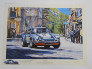 Edition of 500, Autographed by Gijs Van Lennep and legendary Porsche driver Hurley Haywood. and Nicholas Watts. This stunning print shows the victorious Martini-Porsche 911 Carrera driven by Herbert Muller and Gijs Van Lennep driving through the village at the 57th Targa Florio, Sicily on May 13, 1973.
