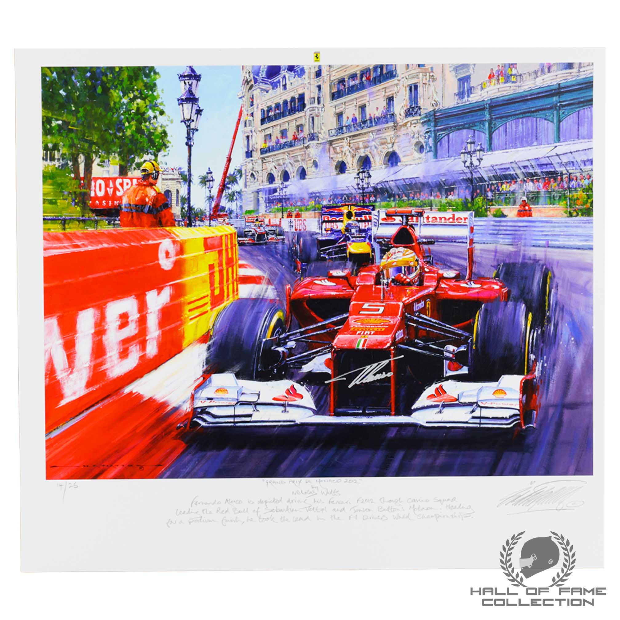 The image shows Fernando Alonso driving his Ferrari F 2012 through Casino Square, leading the Red Bull Renault of Vettel and Button’s McLaren. Heading for a podium position, he took the lead in the F1 Championship.