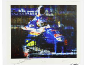 This print created from an original painting by Juan Carlos Ferrigno features Jacques Villeneuve, the 1997 Formula One World Champion, in the Williams Ranault FW19. Edition size 850.