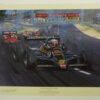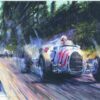 This exciting racing scene is a limited editon of 50 giclees produced from an original painting by Nicholas Watts. It highlights the great racing driver Sir Stirling Moss leading the pack at Nurburgring. Hand autographed by Sir Stirling Moss.