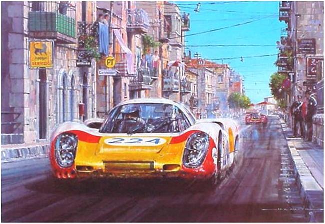 The Vic Elford and Umberto Maglioli driven Porsche 907 is shown racing through Cerda’s main streets in the 52nd Targa Florio. Despite losing twenty minutes due to a tire and wheel problem during the opening lap, it was Elford who gave a display of inspired driving to snatch victory away from Alfa Romero. He set both a new speed and lap record over the tortuous Little Madonie Mountain Circuit. Autographed by Vic Elford.