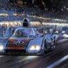 Luigi Chinetti’s second victory at Le Mans was notable for his outstanding driving and his pit crew’s ability to produce chewing gum on demand to stem the flow of fuel from a fractured petrol tank. Driving an Alfa 8c 2300 with Philip Etancelin, it was to be Alfa’s final victory at Le Mans. The image shows Chinetti leading an Aston Martin Ulster and a Lagonda through Tertre Rouge. Le Mans 1934